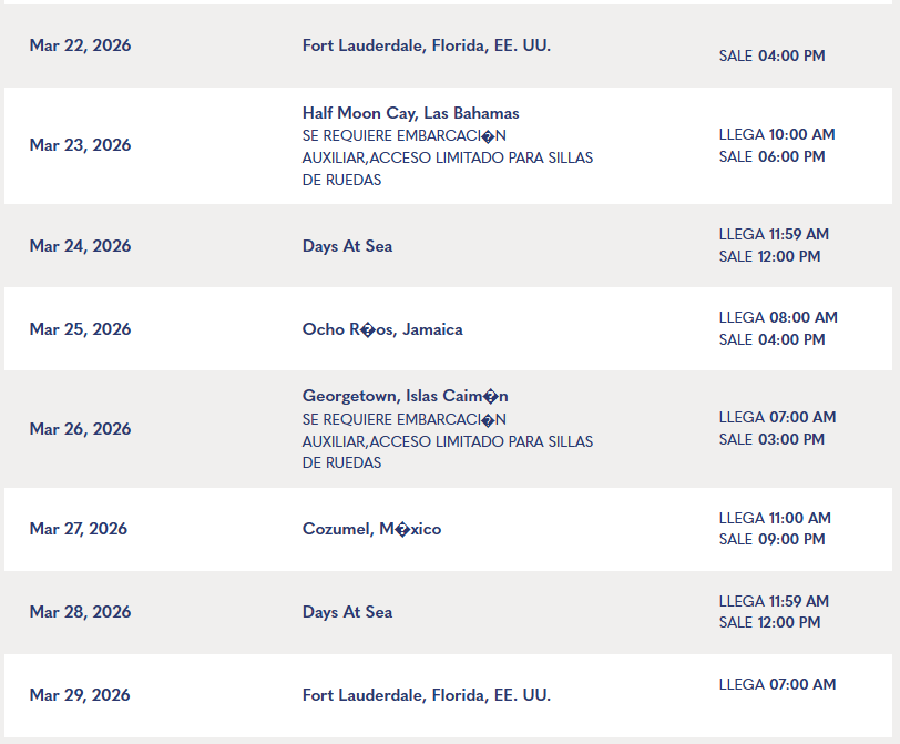 Fort Lauderdale, Florida, EE. UU., Days At Sea, Half Moon Cay, Las Bahamas, Days At Sea, Ocho R�os, Jamaica, Georgetown, Islas Caim�n, Cozumel, M�xico, Fort Lauderdale, Florida, EE. UU.