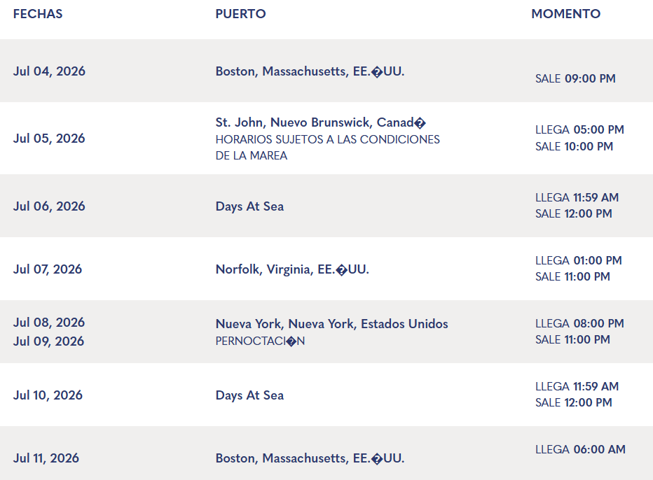 Puertos: Boston, Massachusetts, EE.�UU., St. John, Nuevo Brunswick, Canadá, Days At Sea, Norfolk, Virginia, EE.�UU., Nueva York, Nueva York, Estados Unidos, Days At Sea,Boston, Massachusetts, EE.�UU.
