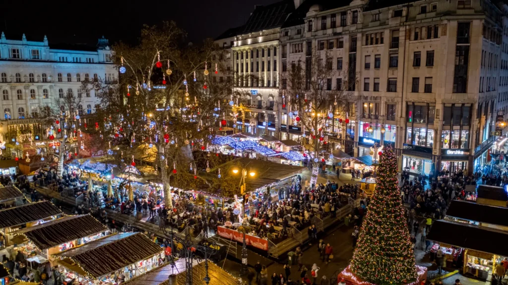 Budapest ofrece una Navidad más íntima, cultural y profundamente ligada a su gastronomía. El mercado de la Plaza Vörösmarty abre temprano y es considerado uno de los más bellos de Europa del Este. Aquí encontrarás artesanías húngaras, música en vivo y platillos como el lángos, el gulash, los embutidos ahumados y postres locales.